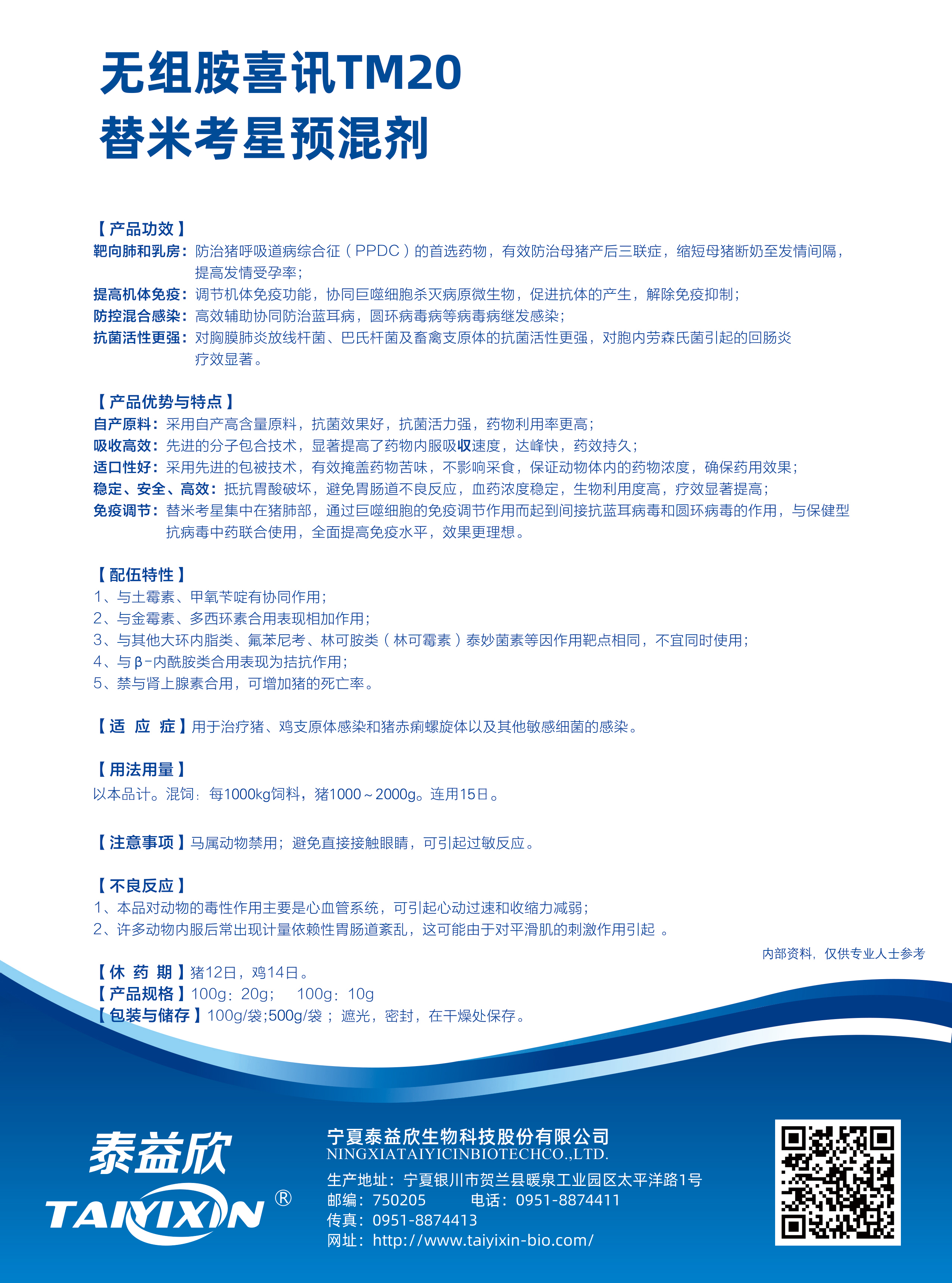 免疫调节:替米考星集中在猪肺部,通过巨噬细胞的免疫调节作用而起到间接抗蓝耳病毒和圆环病毒的作用,与保健型抗病毒中药联合使用,全面提高免疫水平,效果更理想。
