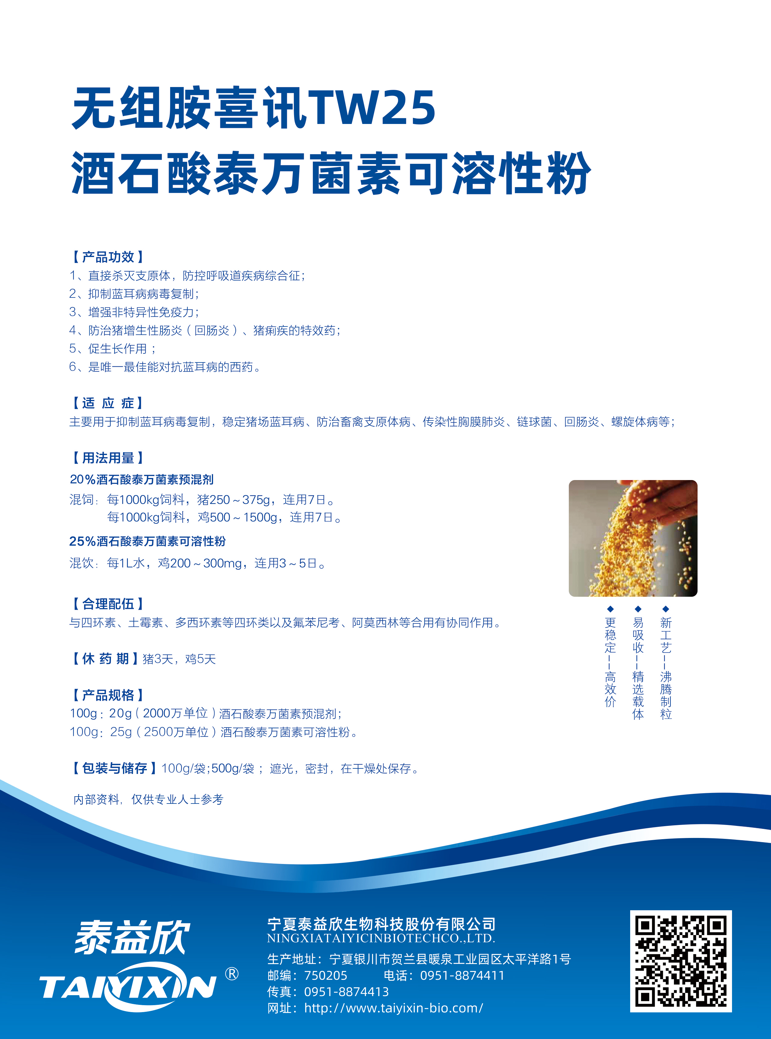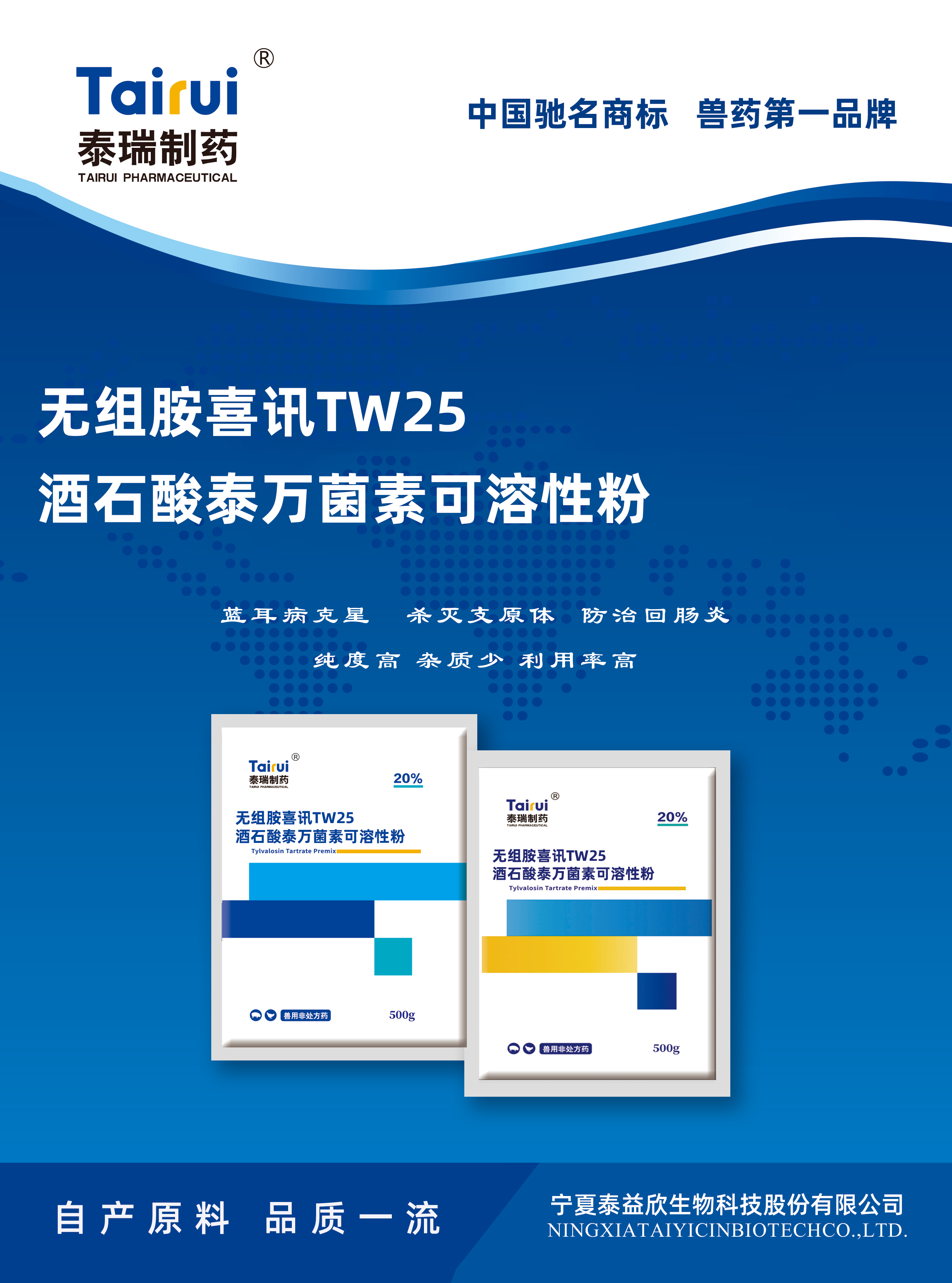 酒石酸泰万菌素对许多革兰氏阳性菌及某些阴性菌有抵抗活性,包括支原体、弧菌、螺旋菌和大病毒,对鸡败血支原体、猪流行性肺炎、猪赤痢等有独特的疗效,并适用于住猥琐性鼻炎、禽霍乱、鸡慢性呼吸道疾病、小牛支原体引起的肺炎等疾病的预防和治疗。本品具有比泰乐菌素更宽的安全系数,是对禽畜支原体病有明显疗效的理想药物。