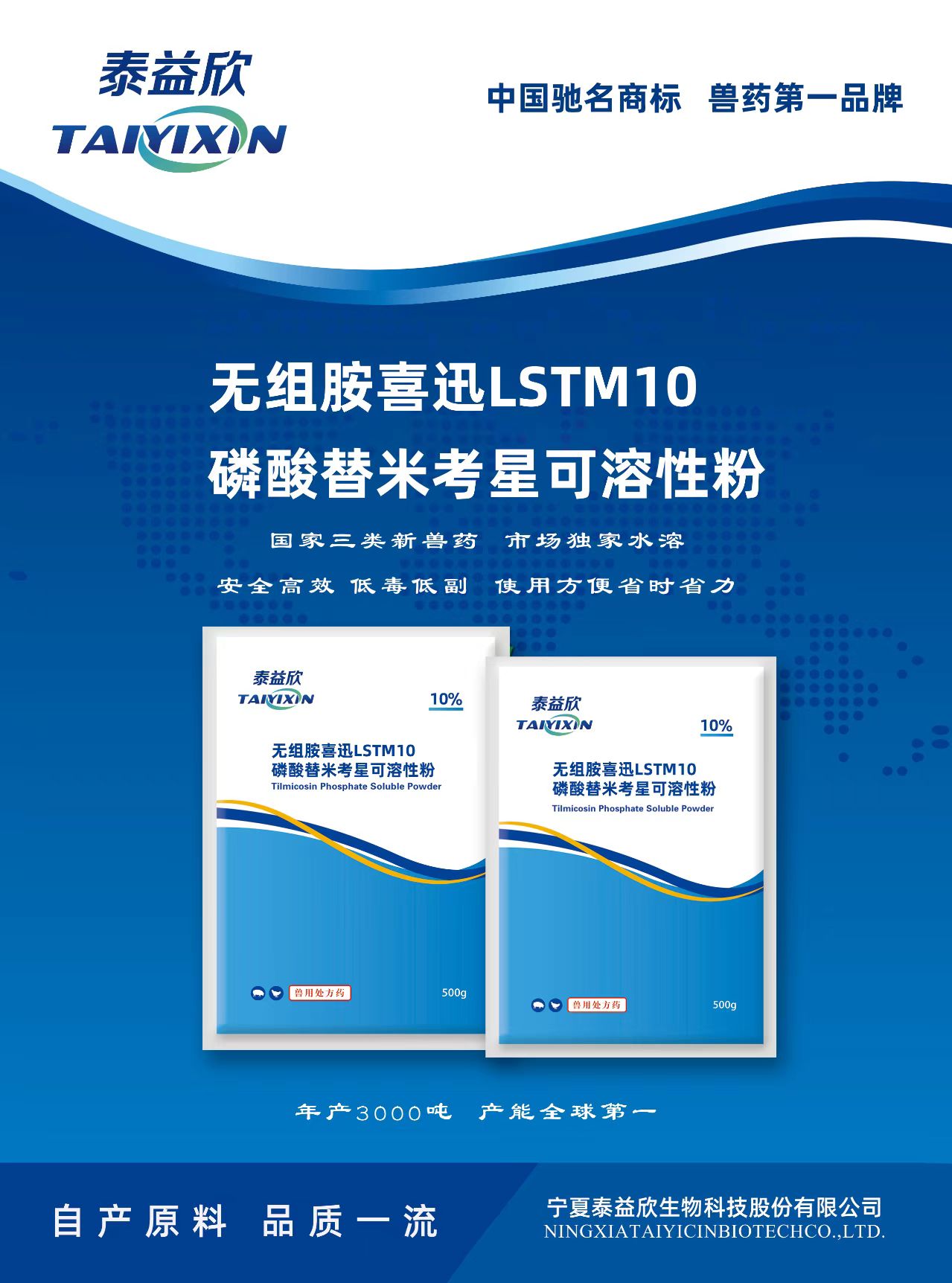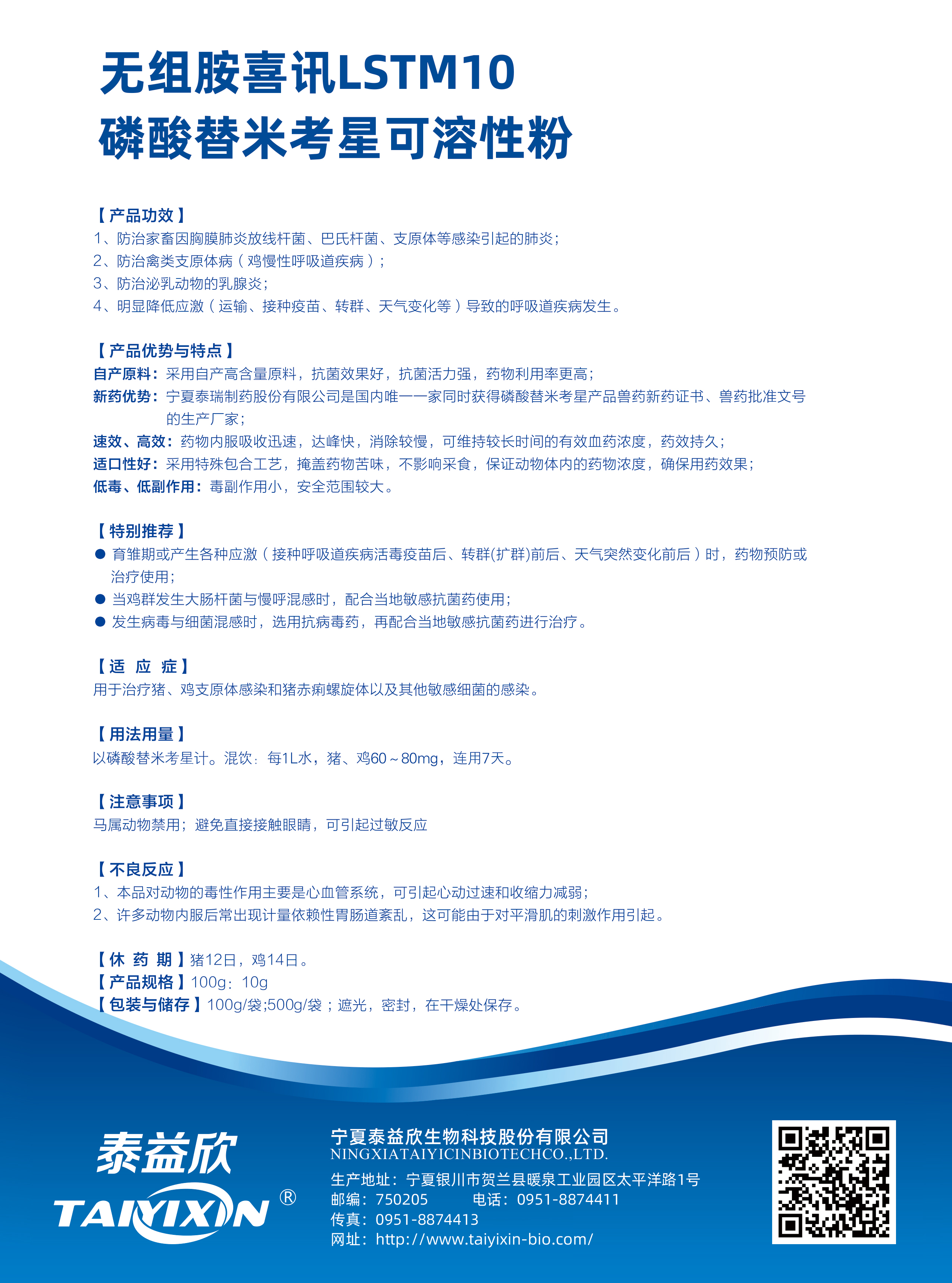 新药优势:宁夏泰益欣生物科技股份有限公司是国内唯--家同时获得磷酸替米考星产品兽药新药证书、兽药批准文号的生产厂家